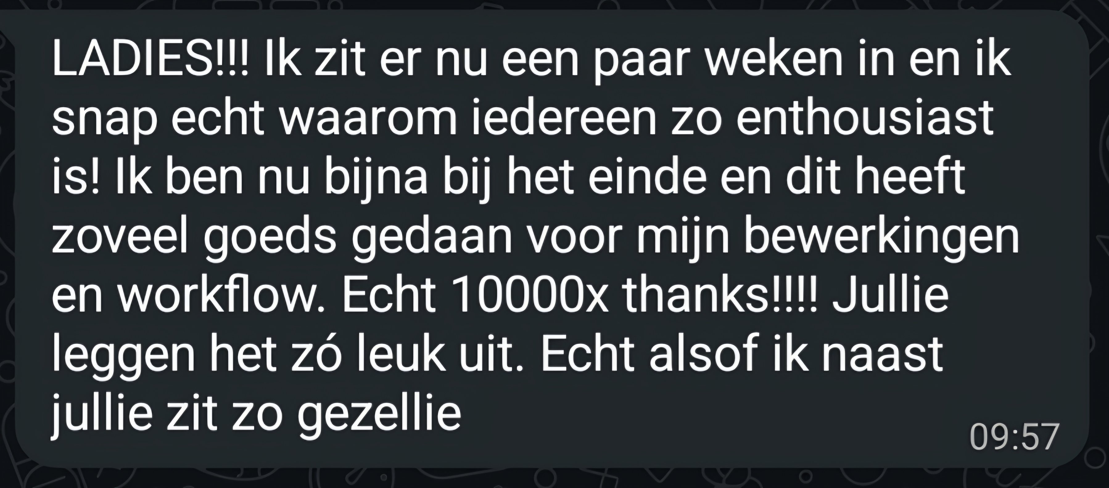 Met uitgebreide video’s, realistische voorbeelden, alle tools uitgelegd (inclusief wat je mag overslaan) en een stijl die je zelf kunt opbouwen.