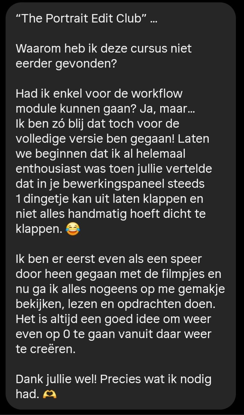 Elke module is logisch opgebouwd en meteen toepasbaar, zodat je niet alleen meekijkt maar ook echt begrijpt waarom iets werkt. De video’s zijn duidelijk, realistisch en gericht op portretten zoals jij ze maakt in de studio of op locatie.